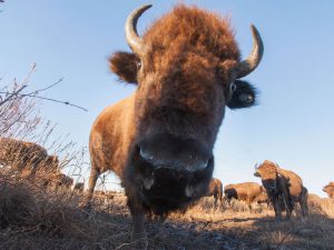 Bison once roamed the Great Plains in North America in numbers so great that early explorers could not count them. They were variously described as: “numbers-numberless,” “the country was one black robe,” and “the plains were black and appeared as if in motion.” However, intensive market hunting, commercial slaughter, and systematic extermination in the late 1800’s led to their near extinction.