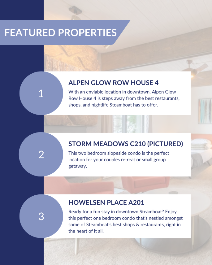 Call us at Steamboat Lodging Company, we are your local boots on the ground lodging company providing top notch accommodations and assistance with all things Steamboat 970-457-4785
