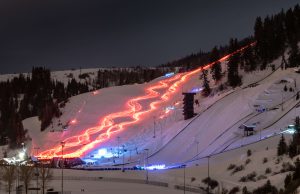 (Ages 5 – 8 and 9-11) Two people on skis tie legs together (ties provided) and race to finish line. The first pair over the finish line wins.